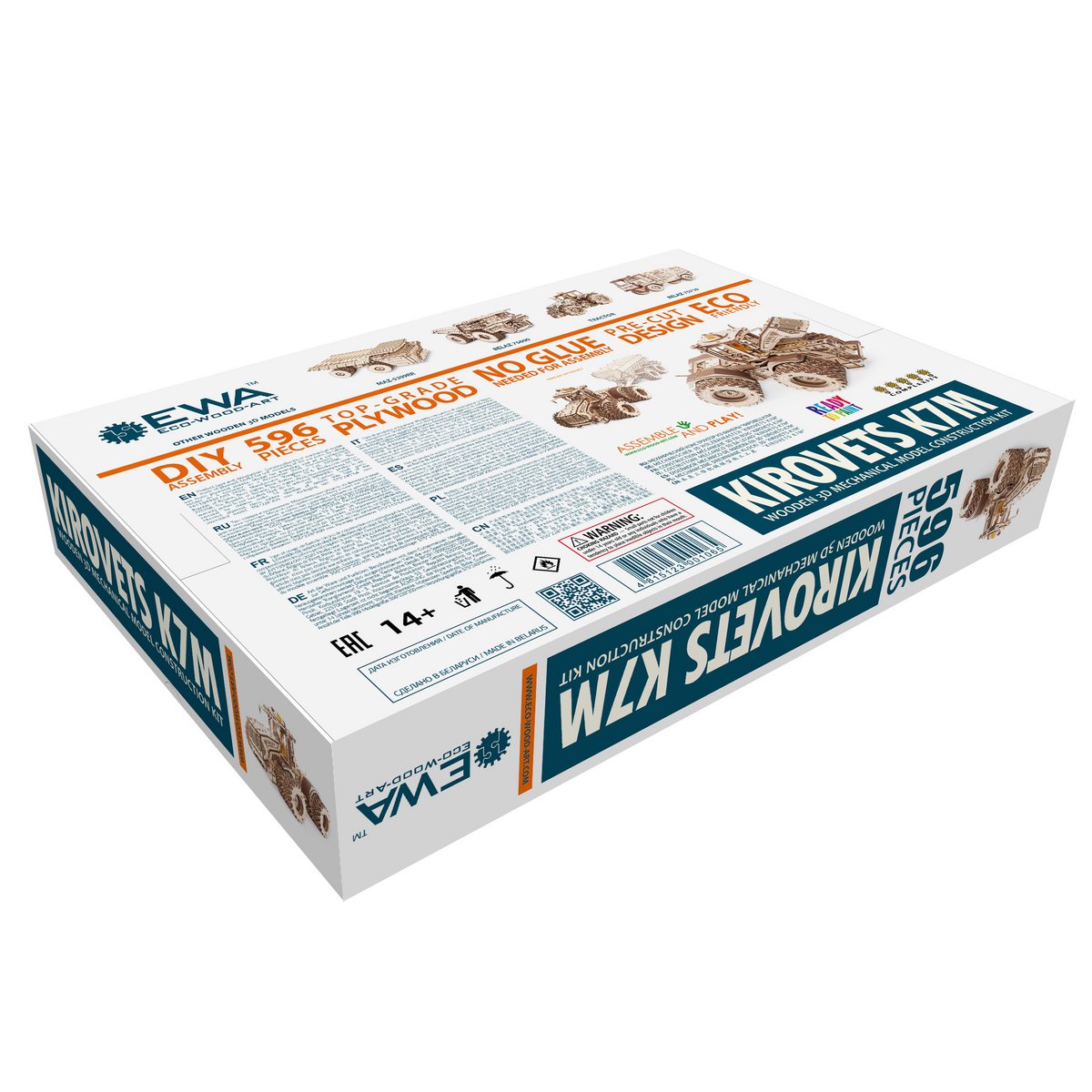 Mechanische houten 3D-puzzel van de vierwielaangedreven tractor Kirovets K-7M van EWA Eco-Wood-Art.