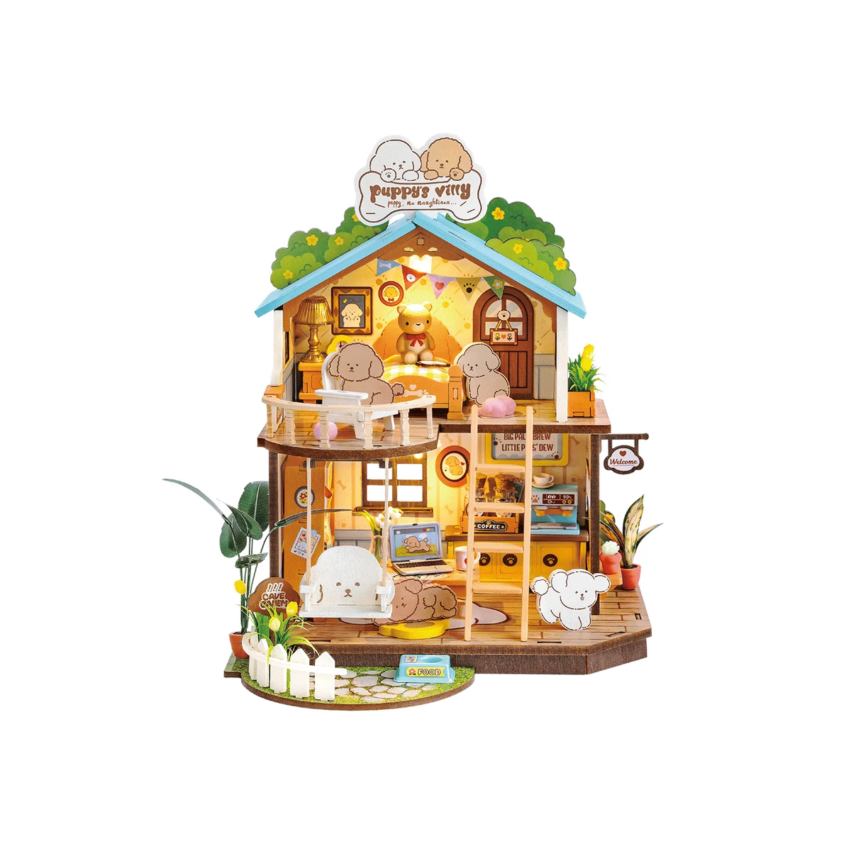 Robotime, DIY Huisje Puppy's Cozy Villa met LED verlichting DG169, 22x18,3x23,5cm