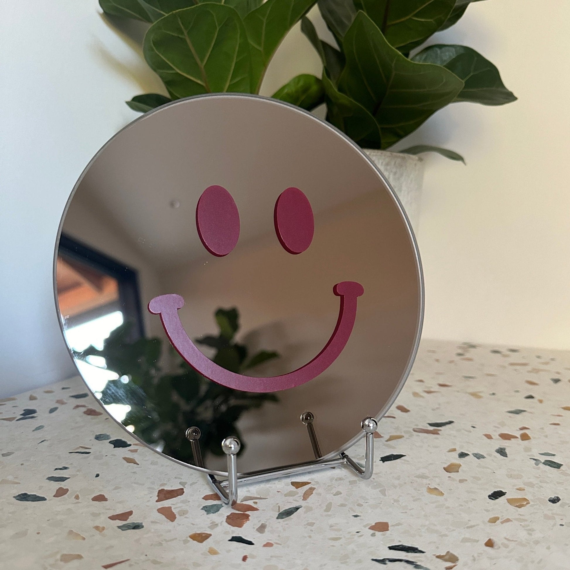 Stralend in eenvoud: deze 20 cm ronde spiegel straalt rust uit, met een subtiele donkerrode smiley. Perfect voor een vleugje sereniteit.